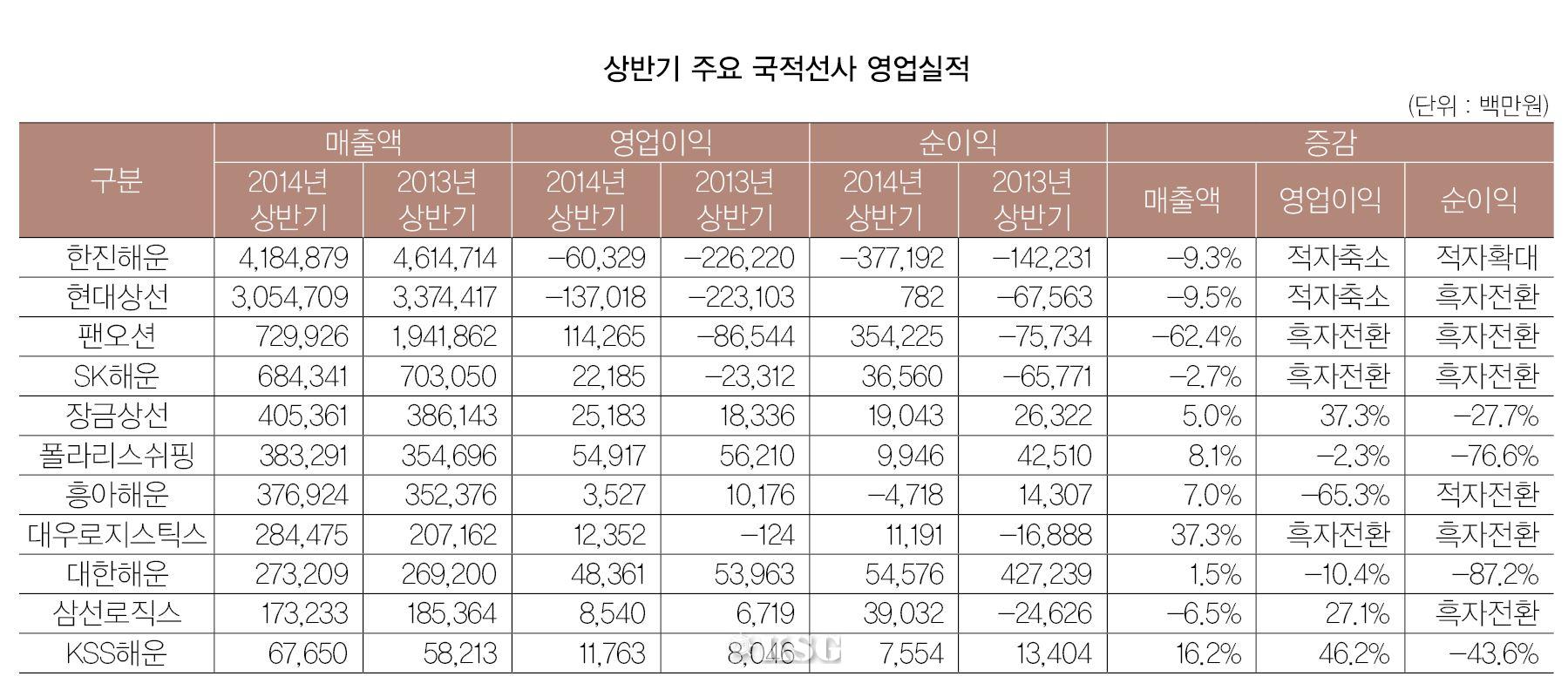●●●올해 해운시장은 기대만큼의 시황 호전을 보여주지 못하고 있다. 건화물선운임지수는 1000포인트대 아래에서 3개월간을 헤매다 8월 중순 이후 1000선을 다시 회복했다. 컨테이너선 시장은 상황이 다소 나은 편이긴 하지만 선사들이 견실한 흑자재정을 거둘 만큼 호의적이진 못하다는 평가다. 주요 국적선사들이 상반기 실적을 발표했다. 선사 실적 분석을 토대로 해운시장을 가늠해본다.