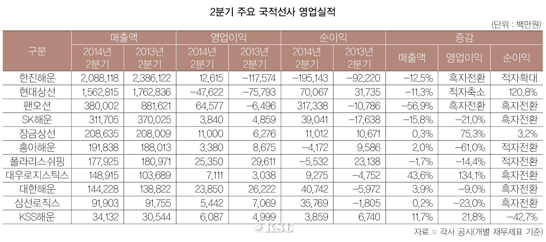 한진해운은 2분기에 영업이익 126억원, 순손실 1951억원을 각각 냈다. 매출액은 두 자릿수로 하락했다. 컨테이너선부문에서 375억원의 영업이익을 달성, 1분기 -358억원 대비 괄목할 만한 흑자성적을 거뒀다. 북미항로와 유럽항로에서의 운임회복이 소기의 성과를 거두면서 흑자 실적의 디딤돌을 놨다는 평가다. 한진해운의 물동량은 114만2700TEU를 수송, 1분기의 111만7300TEU에 견줘 2.3% 늘어났다. 북미항로에서 5.2% 유럽항로에서 4.2%의 증가 폭을 보였다. 아시아 등의 항로에선 감소세를 띠었다. 벌크선부문은 249억원의 영업손실로 적자 행진을 이어갔다. 상반기 벌크선 시장이 깊은 침체를 보인 것과 무관치 않다. 한진해운은 비교적 알짜사업으로 평가받던 전용선 부문을 매각한 까닭에 벌크선 부문에서의 적자는 앞으로도 계속 이어질 것으로 전망된다.