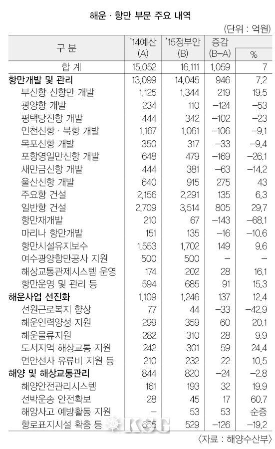 부산 신항만 개발 예산이 올해 1125억원에서 내년 1344억원으로 늘어났으며 울산신항 개발 예산은 640억원에서 915억원으로, 인천신항 개발 예산은 490억원에서 596억원으로 각각 증액됐다. 반면 광양항 개발 예산은 234억원에서 110억원으로 줄었다.