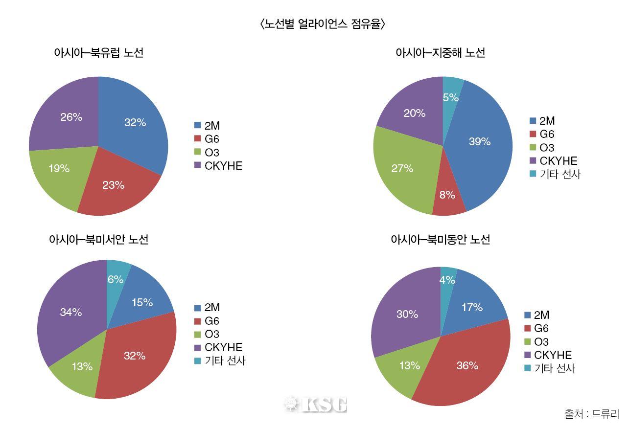 4대 얼라이언스의 전체 노선 점유율은 2M이 527만TEU로 28.5%, G6가 328만TEU로 17.9%, CKYHE가 307만TEU로 16.6%, O3가 256만TEU로 13.9%를 차지한다. 4대 얼라이언스가 전체 노선의 77%를 차지하는 것이다. 이로써 동서항로 뿐만이 아니라 전체 노선에서 얼라이언스 비참여 선사인 함부르크수드, 짐라인, PIL 등의 입지는 점차 좁아질 것으로 예측된다.