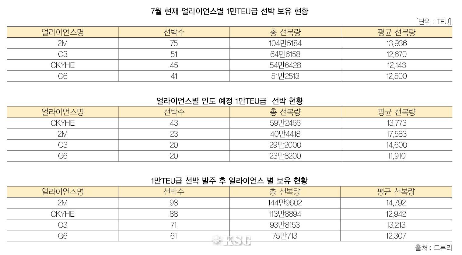 드류리에 따르면 올해 7월 현재 대형 선박을 가장 많이 보유한 얼라이언스는 2M이다. 2014년 7월 2M이 보유한 1만TEU급 이상 선박은 75척으로 총 선복량은 104만5184TEU로 나타났다. 초대형 컨테이너 선대의 평균 선복량은 1만3936TEU다. 2M 참여 선사인 머스크라인은 세계 최대 선대인 1만8000TEU급 ‘트리플 E’를 보유하고 있다. MSC 역시 스콜피오를 통해 1만9000TEU급 선박을 확보할 것으로 예정돼 있어 2M은 얼라이언스 중에서도 가장 큰 선대를 운영하게 된다.