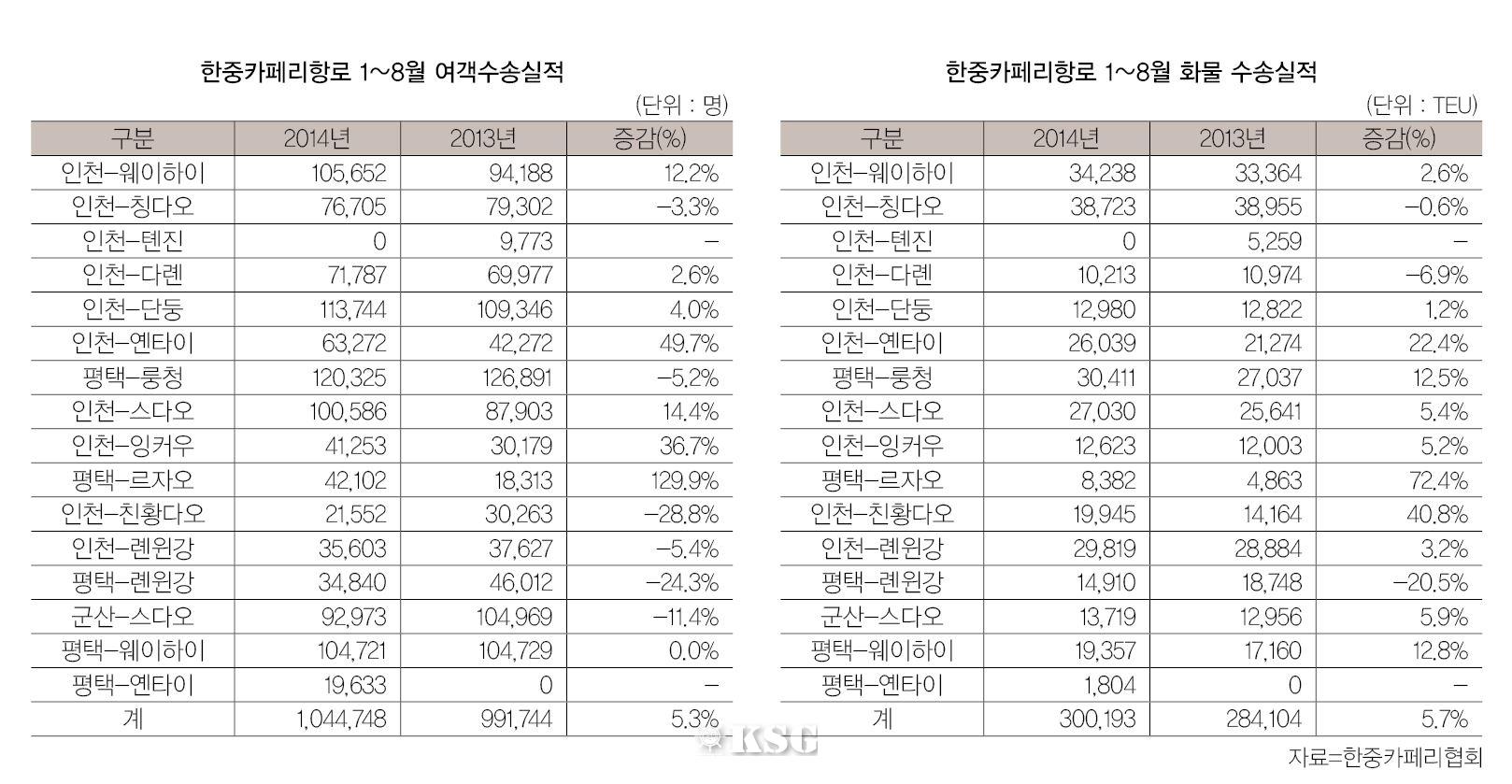 한편 최근 한중카페리항로 수송실적은 여객의 부진, 화물의 호조로 요약된다. 8월까지 여객수송실적과 화물수송실적은 각각 104만5000명 30만TEU로 5%의 성장률을 나타냈다. 하지만 월간 실적에선 희비가 엇갈린다. 7월과 8월 화물 수송실적은 각각 8.9% 16.5%의 증가율을 나타내며 상승곡선을 그렸다. 신설항로 개설과 중단항로 재취항 등이 실적 성장의 배경이다. 반면 여객 실적은 -10.3% -8.7%의 마이너스 성장을 기록했다. < 세월 >호 사고 여파로 국내 여행객 감소가 표면화된 까닭이다.