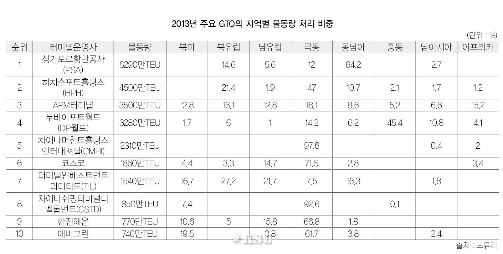 영국 해운전문 컨설팅 업체인 드류리는 전 세계 컨테이너터미널 운영사들의 2013년 실적을 발표했다. 지난해 한진해운은 2012년 780만TEU 대비 1.2% 감소한 770만TEU의 컨테이너를 처리하며 세계 컨테이너터미널 운영사 순위에서 9위를 차지했다. 특히 한진해운은 극동아시아에서의 운영 비중이 매우 높은 것으로 나타났다. 한진해운의 극동지역 비중은 66.8%에 이른다. 이어 남유럽과 북미지역도 두 자릿수의 물동량 비율을 보였다.