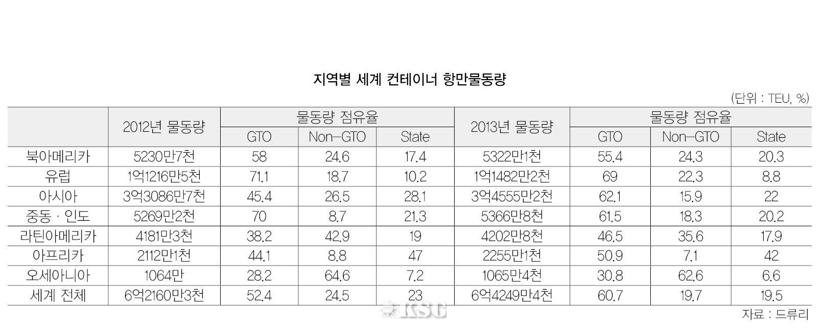세계 컨테이너터미널 운영사 처리 비중이 가장 높은 지역은 유럽이었다. 유럽은 69%의 비중을 보였으며, 가장 낮은 곳은 오세아니아로 30.8%의 비중을 기록했다. 지난해 운영사의 처리 물동량 비중이 가장 크게 증가한 지역은 아시아로 2012년 45.4%에서 2013년 62.1%로 급증했다. 운영사들은 지난해 세계 컨테이너 물동량의 60.7%를 처리했으며 그 비중은 전년 대비 8.3% 증가했다.
