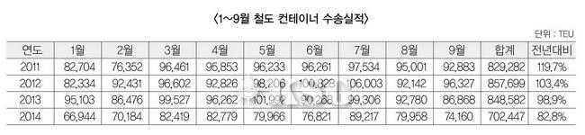 지난 5일 한국철도공사와 한국철도물류협회에 따르면 올 1월~9월 철도 수송된 컨테이너 물동량은 20피트 컨테이너(TEU) 70만2447개로 지난해 같은 기간 84만8582TEU와 비교해 17.2% 감소했다. 2011년 이후 3분기 누적 철도 수송량은 80만TEU를 훌쩍 넘었지만 올해는 70만TEU도 겨우 넘기면서 전년대비 82.8%의 수송량을 보였다.