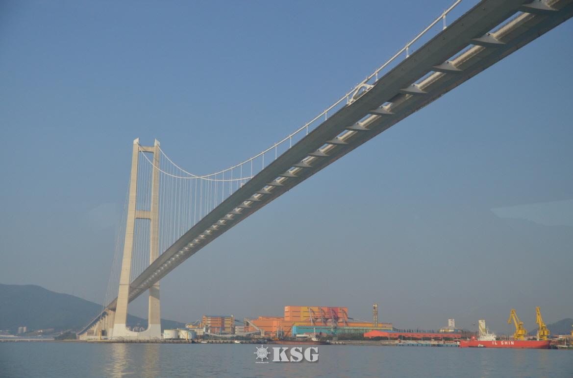 < 월드마린 >호에 가장 먼저 손짓을 한 건 이순신대교였다. 1조644억원을 투입해 건설된 이순신대교는 전라남도 여수시 묘도동과 전라남도 광양시 금호동을 연결하는 국내 최대 현수교로 총 길이가 2260m에 달하는 세계에서 4번째로 긴 현수교다. 100% 국산자재·장비·기술로 시공된 한국형 현수교라는 점에서 의미가 크다. 지난해 2월 개통한 이순신대교는 광양항 항만물류업계의 비용절감에 지대한 역할을 하고 있다. 여수-광양간 화물 이동시간을 대폭 줄였기 때문이다. 낮보다 밤이 아름답다는 말로 많은 사람들에게 회자되고 있는 이순신대교는 여수석유화학단지와 더불어 야경을 만끽하기에 좋은 장소인 것으로 알려졌다.