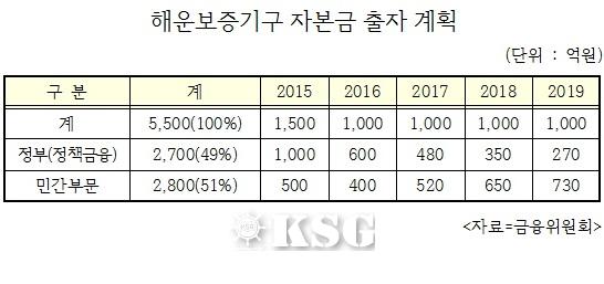 금융위는 앞서 해운보증기구의 자본금 규모를 5500억원으로 확정했다. 정부에서 49%인 2700억원, 민간에서 51%인 2800억원을 2019년까지 순차적으로 출자한다는 내용이다. 내년 출자 규모는 정부 1000억원 민간 500억원 등으로 계획됐다.