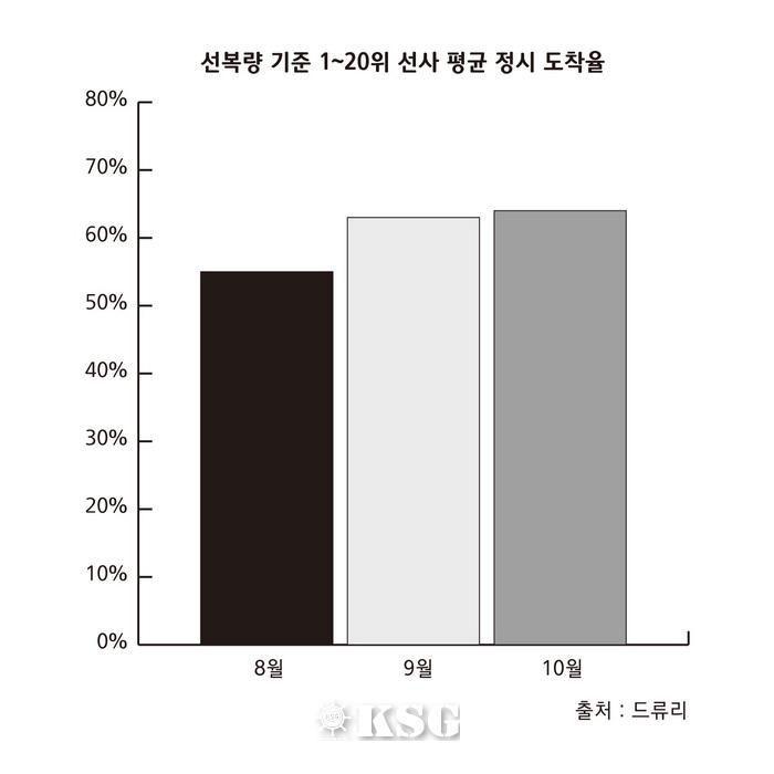 드류리는 자동화된 데이터를 통해 전 세계 350곳의 항만에서 선사들의 정시 도착율을 책정하고 있다. 8월부터 10월까지 석 달간 선복량 기준 1위부터 20위 선사를 대상으로 집계한 평균 정시 도착율은 상승세를 보였다. 10월 평균 정시 도착율은 64%로 9월의 63%, 8월의 55%보다 올라 세 달 연속 증가했다.