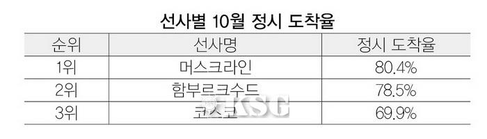 드류리가 발표한 10월 선사별 정시 도착율에서 덴마크의 머스크라인과 독일의 함부르크수드는 가장 높은 정시 도착율을 기록했다. 머스크는 80.4%, 함부르크수드는 78.5%의 정시 도착율을 각각 나타냈다. 두 선사의 뒤를 이어 코스코가 69.9%의 정시율로 양호한 성적표를 받았다. 코스코와 함께 CKYHE 얼라이언스에 속한 우리나라의 한진해운, 에버그린, 케이라인, 양밍 역시 비교적 높은 정시 도착율을 보였다.