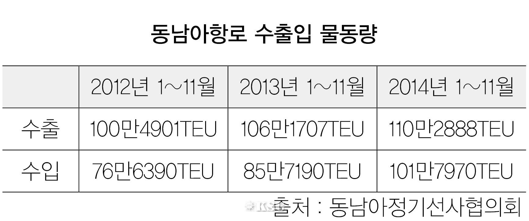 ●●●동남아시아발 한국향 컨테이너 물동량이 올 들어 가파르게 치솟으며 100만TEU를 넘어섰다. 특히 지난해에 이어 올해도 수입 물동량은 초강세를 띠며 역대 최고치를 경신했다. 지금과 같은 추세라면 조만간 수입 물동량이 수출 물량을 뛰어넘을 공산이 크다. 수입 물량이 수출 실적을 뛰어넘는 건 동남아항로에서 처음있는 일이다.