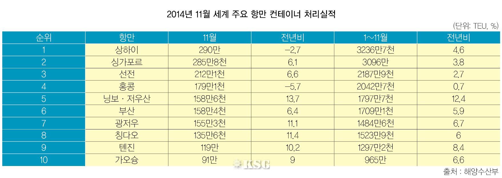 2014년 누계 처리실적(1~11월)에서 부산항을 사실상 6위로 끌어내린 닝보·저우산항뿐만 아니라 세계 7~8위 항만인 칭다오항과 광저우항의 컨테이너 처리량은 괄목한 성장세를 보이며 큰 주목을 받고 있다. 특히 광저우항과 칭다오, 톈진항은 11월 월간 처리실적에서 전년 대비 두 자릿수 성장하며 부산항을 바짝 추격하고 있는 실정이다. 광저우항은 월간 처리실적에서 부산항과 3만1천TEU의 근소한 차이를 보였다.