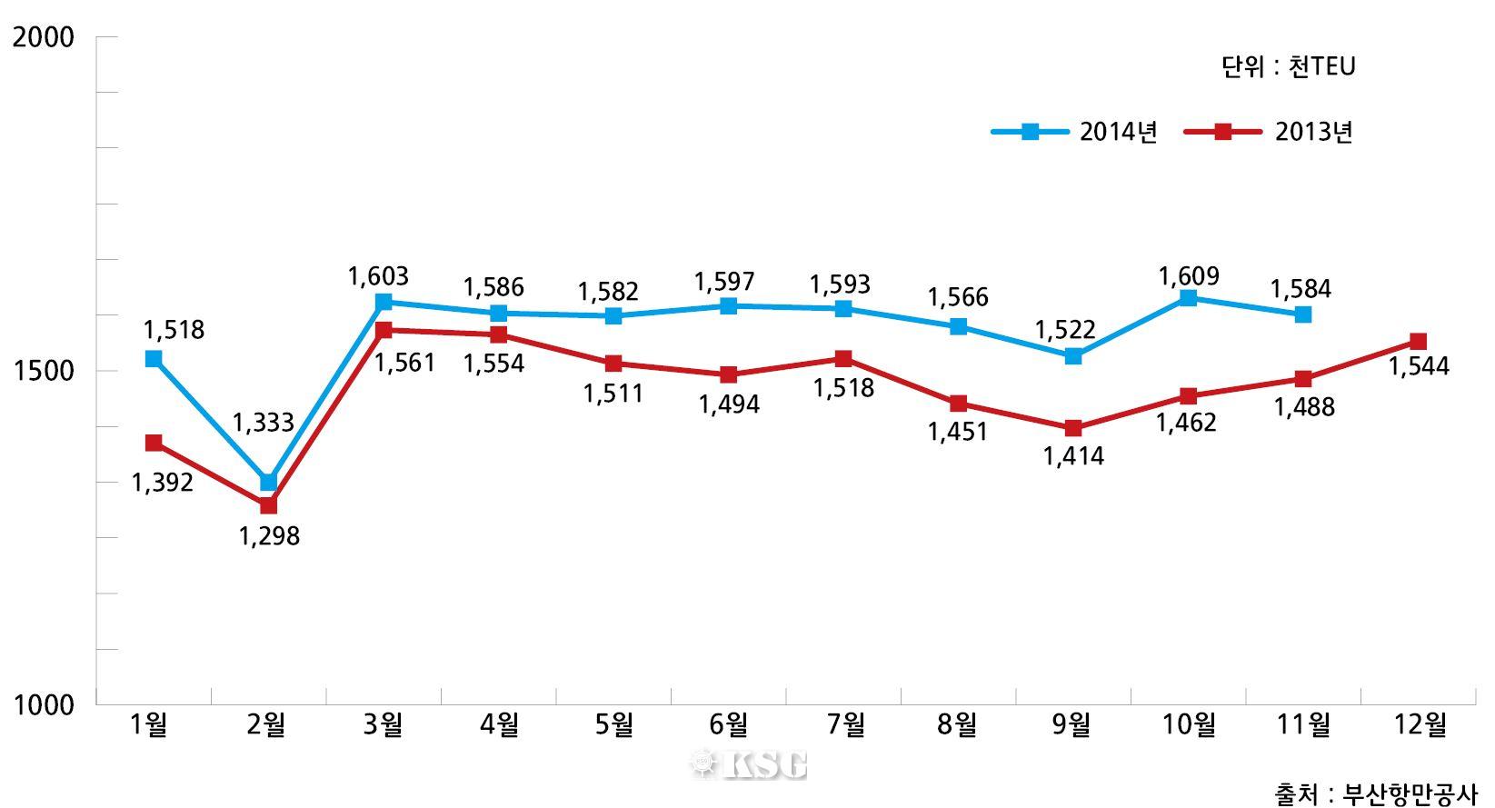 중국 항만이 폭풍성장하고 있지만 부산항의 상승세도 꺾이지 않고 있다. 부산항의 11월 컨테이너 물동량은 전년 동월 대비 6.4% 증가한 158만3817TEU를 기록했다. 11월까지 1709만TEU를 처리한 부산항이 현재의 추세를 이어갈 경우 2014년 물동량 목표인 1820만TEU를 초과해 1860만TEU를 달성할 수 있을 것으로 전망된다.