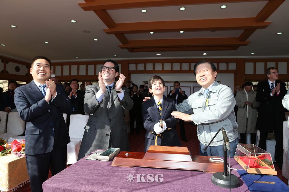 | ▲스폰서를 맡은 오스카 아퐁테 군(사진 오른쪽 두번째)이 선박 명명 도끼질을 한 뒤 선박을 지켜보며 웃고 있다. |