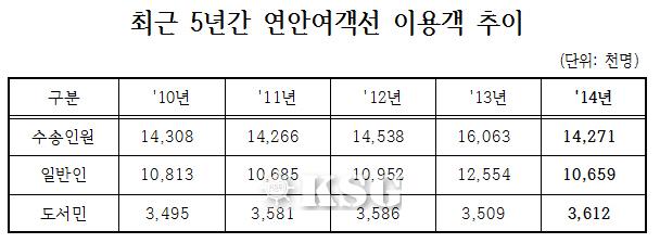 22일 해양수산부에 따르면 지난해 연안여객선을 이용한 승객은 1427만명으로 2013년(1606만명)의 89% 수준에 그쳤다. 연연안여객선 이용객이 줄어든 건 2011년 이후 3년 만이다. 일반인 수송실적이 15% 줄어들면서 전체 이용객 감소를 이끌었다. 반면 도서민 이용실적은 3% 늘어났다.