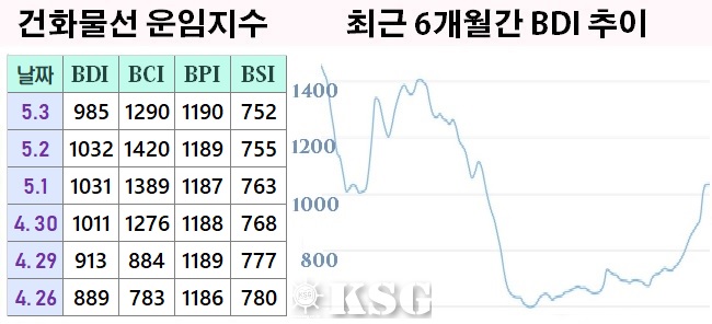 지난 3일 건화물선 운임지수(BDI)는 전거래일보다 47포인트 하락한 985로 마감됐다. 이날 벌크시장은 케이프선의 약세 영향으로 BDI는 23일만에 하락세로 전환됐다. 지난 주 철광석 가격은 재고 비축용의 수요가 늘어나면서 상승세를 기록했다. 석탄 가격은 중...