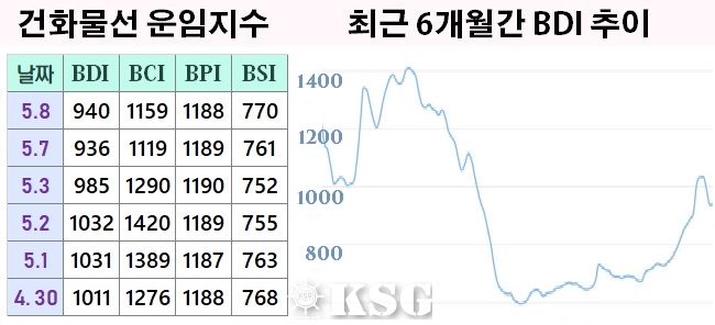 지난 8일 건화물선 운임지수(BDI)는 전거래일보다 4포인트 상승한 940으로 마감됐다. 이날 벌크시장은 지난 주 후반부터 금주 초까지 부진한 모습을 보였던 케이프선이 반등에 성공했다. 파나막스선은 약보합세, 수프라막스선은 강보합세를 이어갔다.