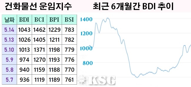 지난 14일 건화물선 운임지수(BDI)는 전거래일보다 17포인트 상승한 1043으로 마감됐다. 이날 벌크시장은 모든 선형에서 상승가 지속됐지만, 케이프 시장의 일부 항로에서 하락 전환되는 모습을 보였다.