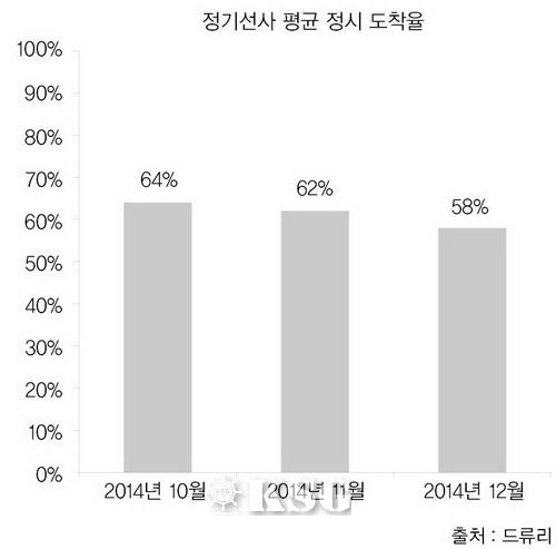 2014년 12월 평균 정시 도착율은 58%...
