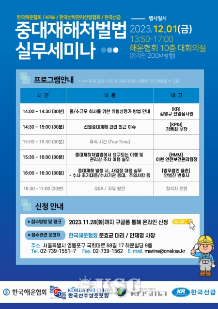 한국선급이 오는 12월1일 서울 여의도에 위치한 해운빌딩 10층 대회의실에서 해운선사를 대상으로 ‘2023 중대재해처벌법 실무세미나’를 개최한다고 밝혔다.