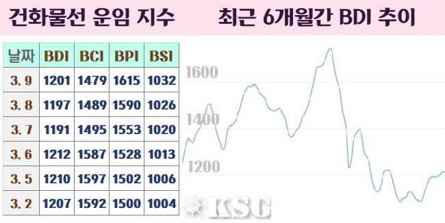 지난 9일 건화물선 운임지수(BDI)는 전거래일보다 4포인트 상승한 1201포인트를 기록했다. 벌크시장은 케이프선의 소폭 하락세는 지속됐지만 중소형선의 상승세에 힘입어 BDI는 1200포인트대에 올라섰다.