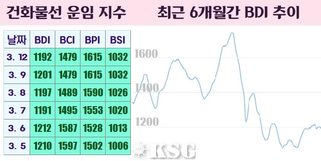 지난 12일 건화물선 운임지수(BDI)는 전거래일보다 9포인트 하락한 1192포인트를 기록했다. 벌크시장은 다시 케이프선의 하락 폭이 커지면서 BDI는 하락세로 전환됐다. 파나막스선은 상승세를 지속했지만 상승 폭이 둔화되는 모습을 보였다.