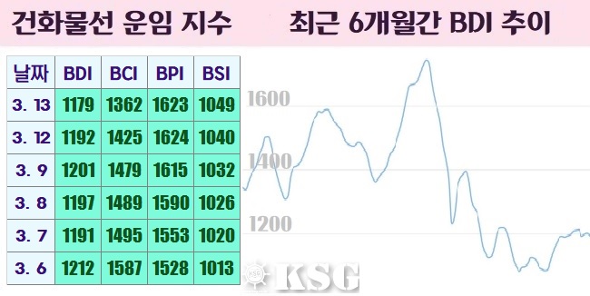 지난 13일 건화물선 운임지수(BDI)는 전거래일보다 13포인트 하락한 1179포인트를 기록했다. 벌크시장은 케이프선을 비롯해 파나막스선도 하락세로 전환되는 등 약세 시황을 나타냈다.