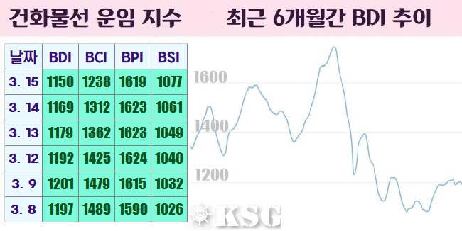 지난 15일 건화물선 운임지수(BDI)는 전거래일보다 19포인트 하락한 1150포인트를 기록했다. 벌크시장은 소형선에서는 꾸준하게 성약 체결이 이뤄지면서 상승세를 나타내고 있지만, 중대형선에서는 약보합세가 지속되고 있다.
