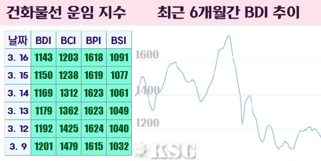 지난 16일 건화물선 운임지수(BDI)는 전거래일보다 7포인트 하락한 1143포인트를 기록했다. 지난 주 벌크시장은 중대형선 약보합세, 소형선 상승세 시황이 지속되면서 BDI는 1주일 새 59포인트 하락했다.