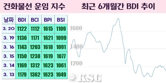 지난 20일 건화물선 운임지수(BDI)는 전거래일보다 14포인트 하락한 1122포인트를 기록했다. 이날 벌크시장은 파나막스선이 하루만에 하락 전환됐고, 케이프선의 하락 폭이 확대되면서 BDI는 하락세가 지속됐다.