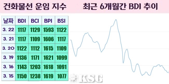 지난 21일 건화물선 운임지수(BDI)는 전거래일보다 5포인트 하락한 1117포인트를 기록했다. 이날 벌크시장은 케이프선의 하락 폭이 줄어들었고, 수프라막스선은 상승세를 지속하면서 전반적으로 운임은 소폭 하락하는데 그쳤다.