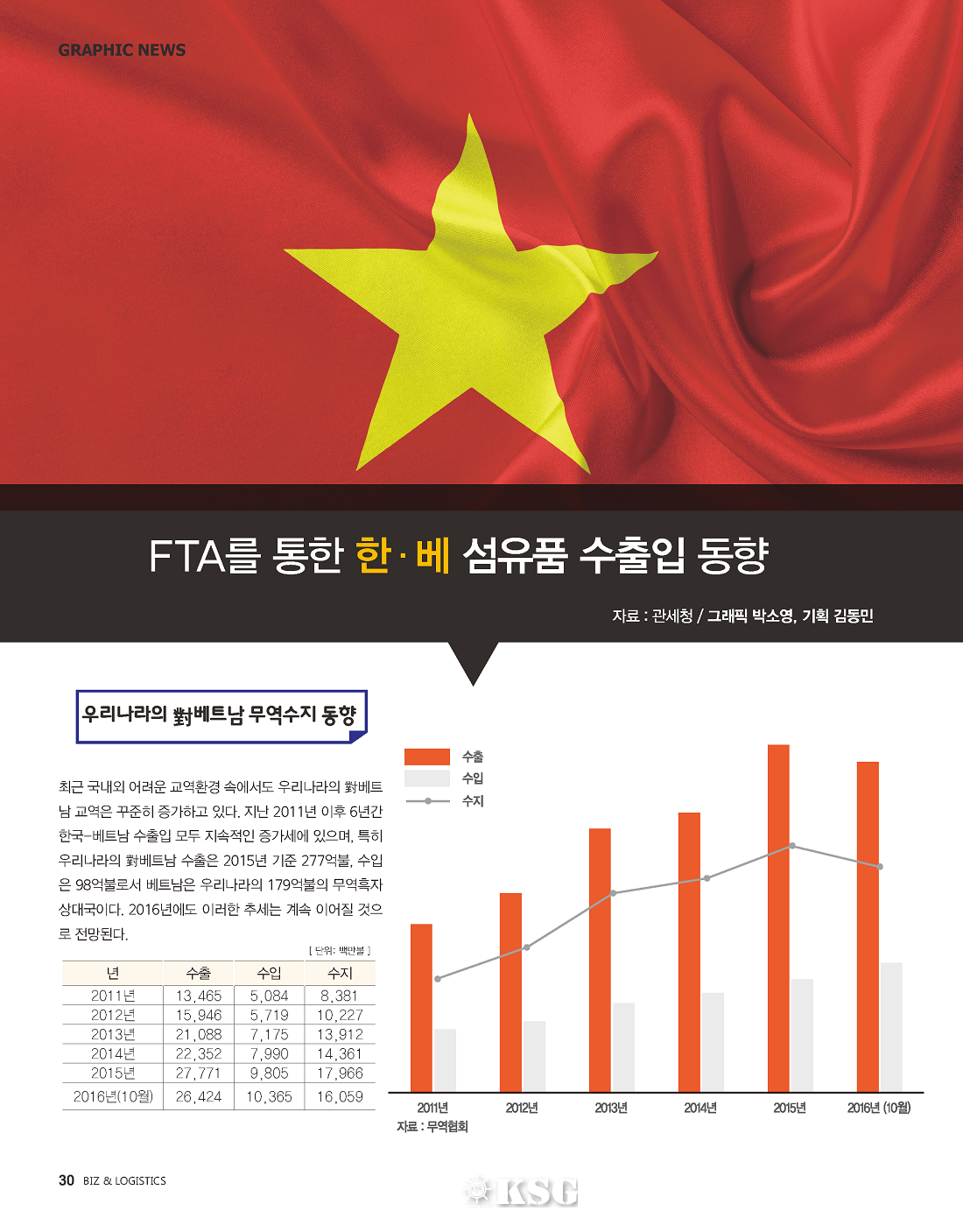 최근 국내외 어려운 교역환경 속에서도 우리나라의 對베트남 교역은 꾸준히 증가하고 있다. 지난 2011년 이후 6년간 한국-베트남 수출입 모두 지속적인 증가세에 있으며, 특히 우리나라의 對베트남 수출은 2015년 기준 277억불, 수입은 98억불로서 베트남은 우리...