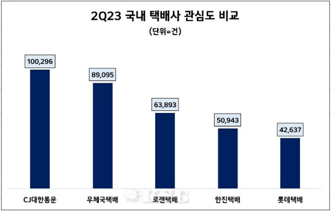 CJ대한통운이 지난 2분기 국내 주요 5개 택배사 중 최다 관심도를 기록한 가운데 로젠택배의 총 포스팅 수가 3위로 올라서 눈길을 끌었다.