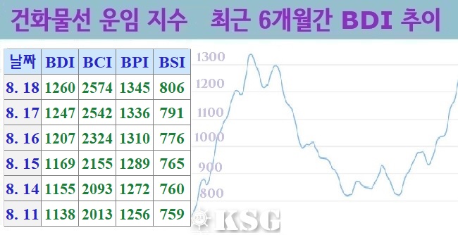 건화물선 운임지수(BDI)는 18일(현지시간) 전거래일보다 13포인트 상승한 1260포인트로 마감됐다. 지난 주 벌크 시장은 신규 수요가 급증하면서 모든 선형 모든 수역에서 상승세를 기록했다. 케이프선은 철광석, 파나막스선은 석탄과 곡물, 수프라막스선은 마이너화...