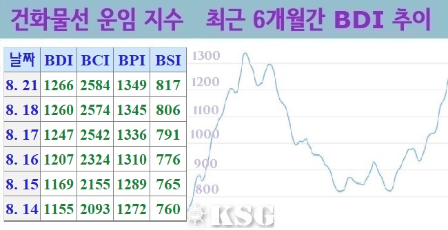 건화물선 운임지수(BDI)는 21일(현지시간) 전거래일보다 6포인트 상승한 1266포인트로 마감됐다. 지난 주 단기급등에 따른 조정이 이번 주 초부터 나타나면서 상승세가 둔화됐다. 하지만 전반적으로 수요가 꾸준한 모습을 보이면서 모든 선형에서 상승세가 지속됐...