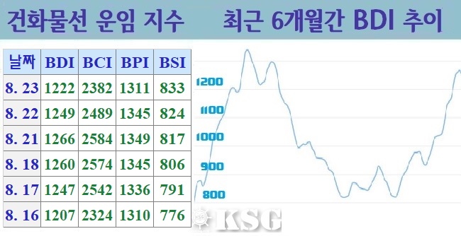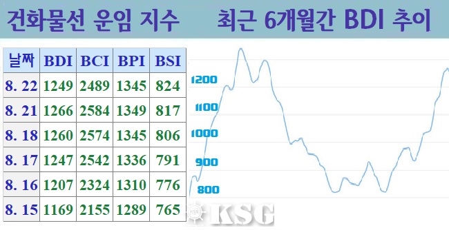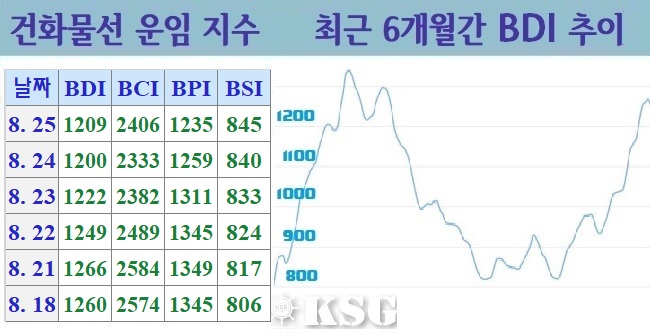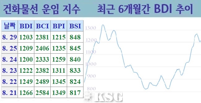 건화물선 운임지수(BDI)는 8월31일(현지시간) 전거래일보다 3포인트 상승한 1184포인트로 마감됐다. 지난 주 후반부터 이번 주 중반까지 전체 벌크시장은 중대형선의 시황 부진으로 하락세가 이어졌다. 하지만 주 중반 이후 케이프선이 살아나면서 BDI는 상승 전...