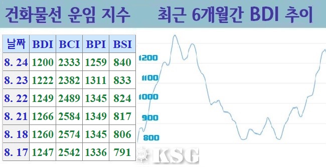 건화물선 운임지수(BDI)는 24일(현지시간) 전거래일보다 22포인트 하락한 1200포인트로 마감됐다. 벌크 시장은 중대형선의 하락세가 지속됐지만, 하락 폭은 줄어들었다. 수프라막스 이하 중소형선에서는 상승세가 이어졌다.