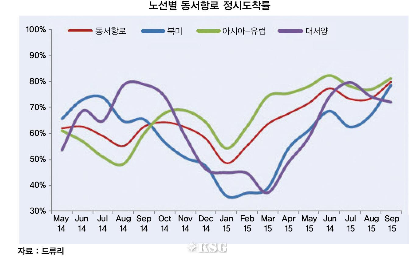 ●●●9월 동서항로의 컨테이너 선사들의 정시 도착율이 지난 3월 이후 최고치를 달성했다.