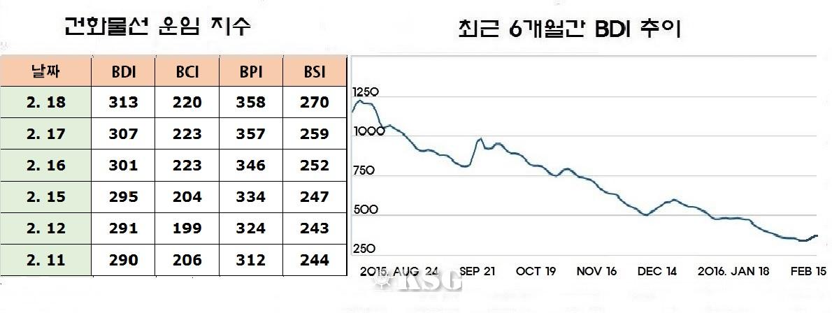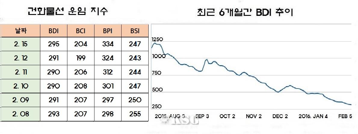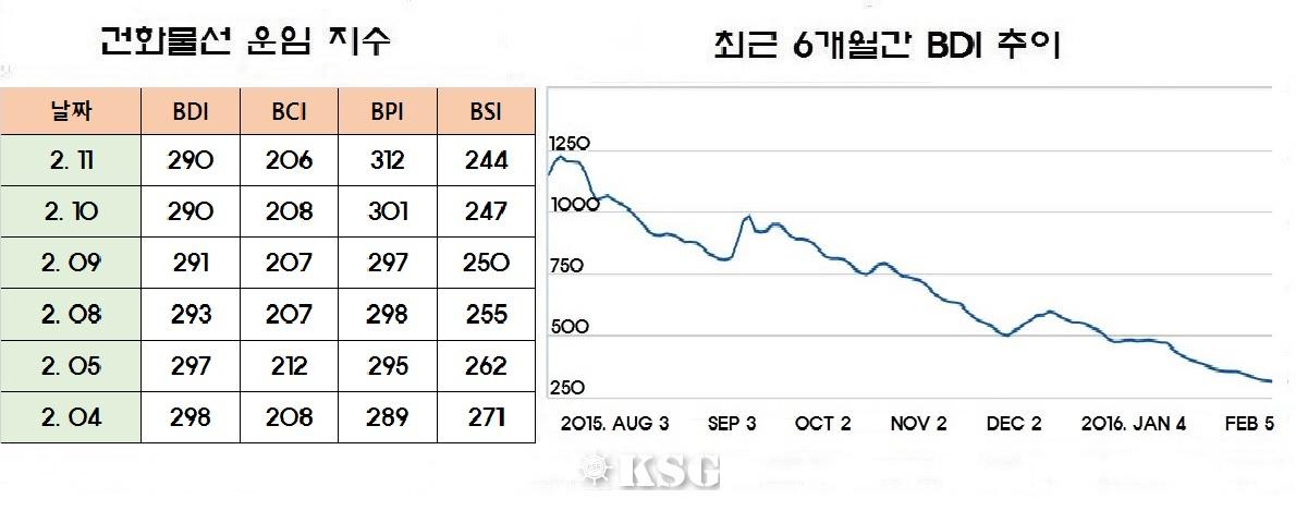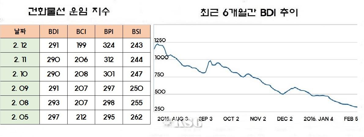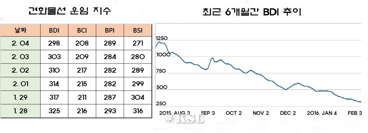 건화물선 운임지수(BDI)는 4일(현지시간) 전거래일보다 5포인트 하락한 298포인트를 기록하며 300포인트대가 무너졌다. 해운업 불황의 끝이 보이지 않는 가운데 중국 연휴가 끝나는 2월 중순 이후부터 수요가 늘어날 것으로 전망돼 벌크 시황도 회복될 것으로 기...