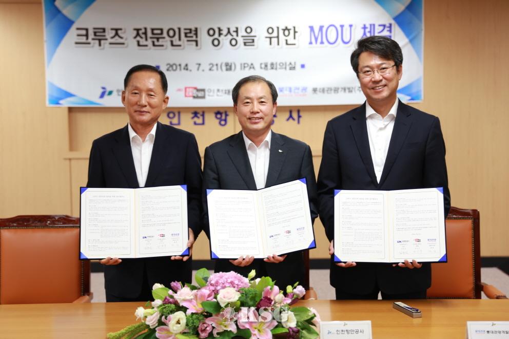 김춘선 인천항만공사 사장(가운데)과 이기우 인천재능대학교 총장(왼쪽), 백현 롯데관광개발 총괄부사장이