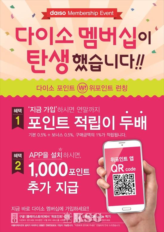 균일가 생활용품숍 ㈜다이소아성산업(회장 박정부)이 실속파 소비자들을 위한 모바일 앱 기반의 ‘위포인트(Wi Point)’ 멤버십 서비스를 시작한다.