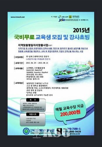 국립 목포해양대학교(총장 최민선) 산학협력단 산하 지역맞춤형일자리창출지원 사업단은 2015년 국비무료 교육생 및 전문강사 요원을 모집한다.