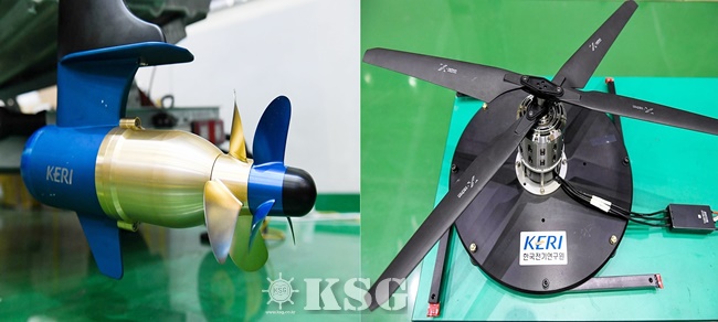 ▲전기연구원이 개발한 비접촉 마그네틱 기어 기반 상반회전 프로펠러(왼쪽 선박용, 오른쪽 항공기용)