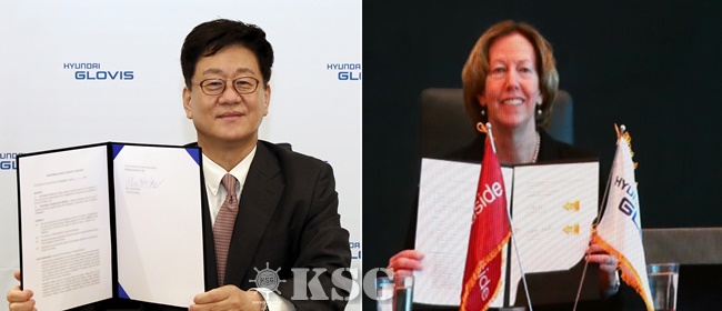 ▲계약 체결식에서 김정훈 현대글로비스 대표(사진 왼쪽)와 멕 오닐 우드사이드 대표가 협약 서명 후 기념촬영을 하고 있다.