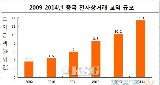중국 전자상거래시장은 2009년부터 꾸준한 성장세를 보였으며, 2013년 중국 전자상거래시장 교역규모는 10조2000억 위안으로 전년대비 29.9% ...