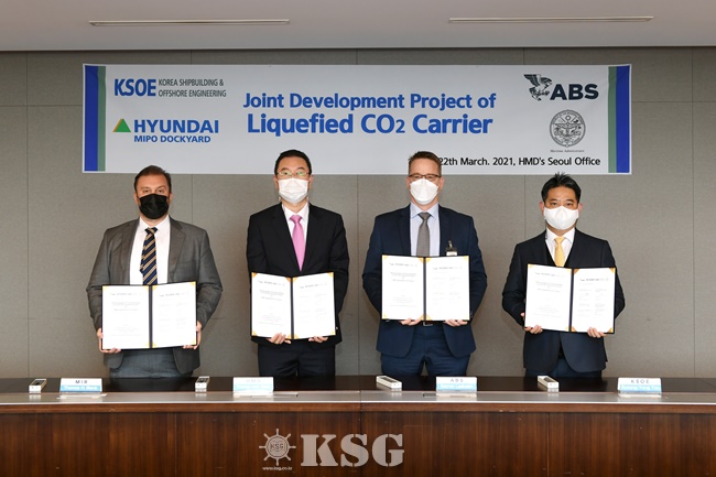 현대미포조선은 22일 서울 계동 현대빌딩에서 한국조선해양, 미국선급(ABS), 마셜제도공화국과 함께 ‘액화 이산화탄소 운반선 개발을 위한 ...