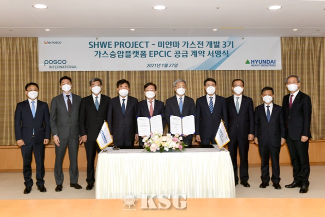 한국조선해양은 27일 서울 포스코센터에서 포스코인터내셔널과 미얀마 3단계 가스전 개발에 투입될 총 2만7000t 규모의 가스승압플랫폼 1기 공사에 대한 본...