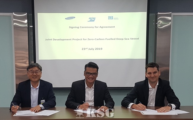 ▲지난해 7월 윤종현 삼성중공업 조선시추설계담당(사진 왼쪽)이 '탄소 제로' 암모니아 추진선박 개발을 위해 MISC, 로이드선급과 JDP를 체결하고 있는 모습