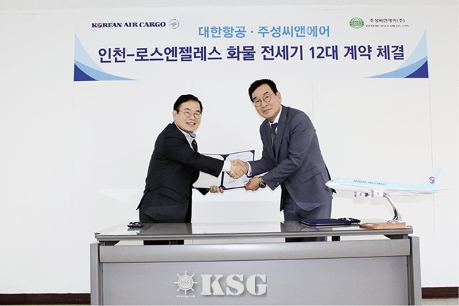 Joo Sung Sea & Air President, Jin Soo Park(Right) and Korean Air Busan Branch manager, Eon Yong Sung signed the air cargo charter agreement to reinforce and enhance the air flight logistics for USA trade,i.e, Incheon-Los Angeles leg.