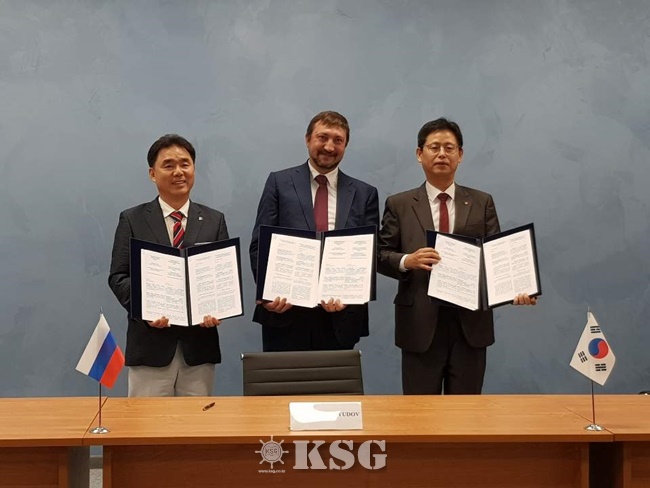 ▲사진 왼쪽부터 KOMERI 공길영 원장, 로사톰카고 알렉산드로 네클류도프 영업이사, 장금상선 임삼섭 상무