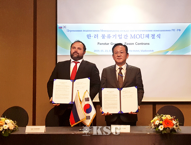 북방 물류 확대를 위해 오거돈 부산시장과 중국과 러시아를 순방 중인 팬스타그룹 김현겸 회장은 23일 블라디보스토크에서 환동해권 복합물류 활성화를 위해 한-중-러 3개 물류기업이 함께하는 업무협약(MOU)을 체결했다.